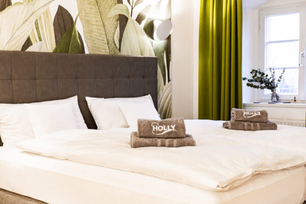 Es stehen insgesamt sieben Ferienwohnungen mit so klingenden Namen wie „Prinzessin Charlotte“ oder „Markgraf Alexander“ zur Verfügung. Sie sind entweder 30 oder 50 m² groß. Alle Ferienwohnungen sind standardmäßig mit einer Küchenzeile ausgestattet und verfügen über ein Bad mit Dusche und WC. Ein Boxspring-Doppelbett, ein Esstisch sowie eine Garderobe und ein Fernseher gehören zur Grundausstattung. In den größeren Wohnungen gibt es darüber hinaus einen Wohnzimmertisch mit einem gemütlichen Sessel zum Entspannen. Handtücher und Bettwäsche können ebenfalls unentgeltlich genutzt werden. Im hauseigenen Bistro HOLLY finden Sie zu den Öffnungszeiten von Frühstück über warme Speisen und Snacks zu Kaffee und hausgemachten Kuchen und Torten alles, was das Herz begehrt.